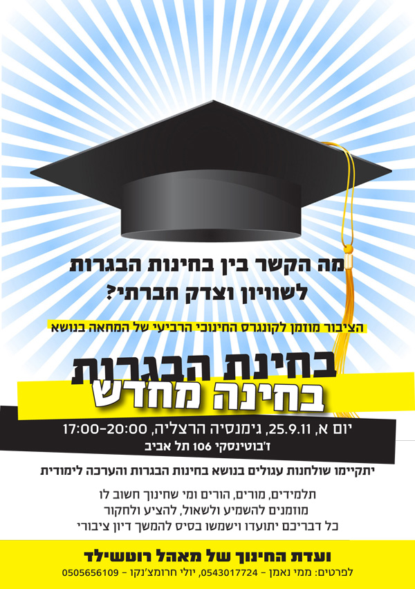 הדיון שנערך ביום ראשון שעבר בוועדת החינוך של מאהל רוטשילד הביא למעגל לראשונה מספר לא קטן של אנשי סגל אקדמי. אני מציע לנצל הזדמנות ברוכה זו ולפתוח, במסגרת וועדת החינוך, דיון שיעסוק בבעיות מערכת ההשכלה הגבוהה בישראל. הדיון יהיה פתוח, הן בנושאיו והן בהרכב משתתפיו, אך יודגשו בו שני הקשרים, המחברים אותו לשיח החינוכי בוועדה ולמחאה הנוכחית בכללה: